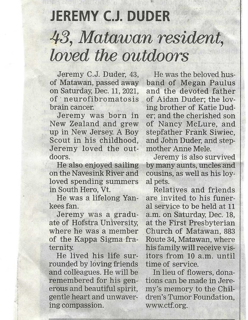 which is committed to finding effective treatments for the millions of people worldwide living with neurofibromatosis (NF). There you can specify that the donation is in memory of Jeremy Duder.